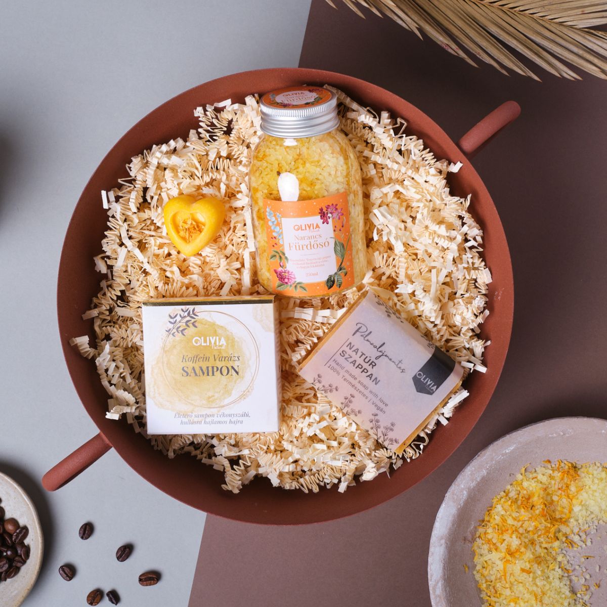 - Az ajándékcsomag tartalma: Koffein varázs szilárd sampon 60 g, Kávé narancs szappan 90 g, Narancs fürdősó 250 ml, Narancs fürdőpraliné kakaóvajjal 20 g