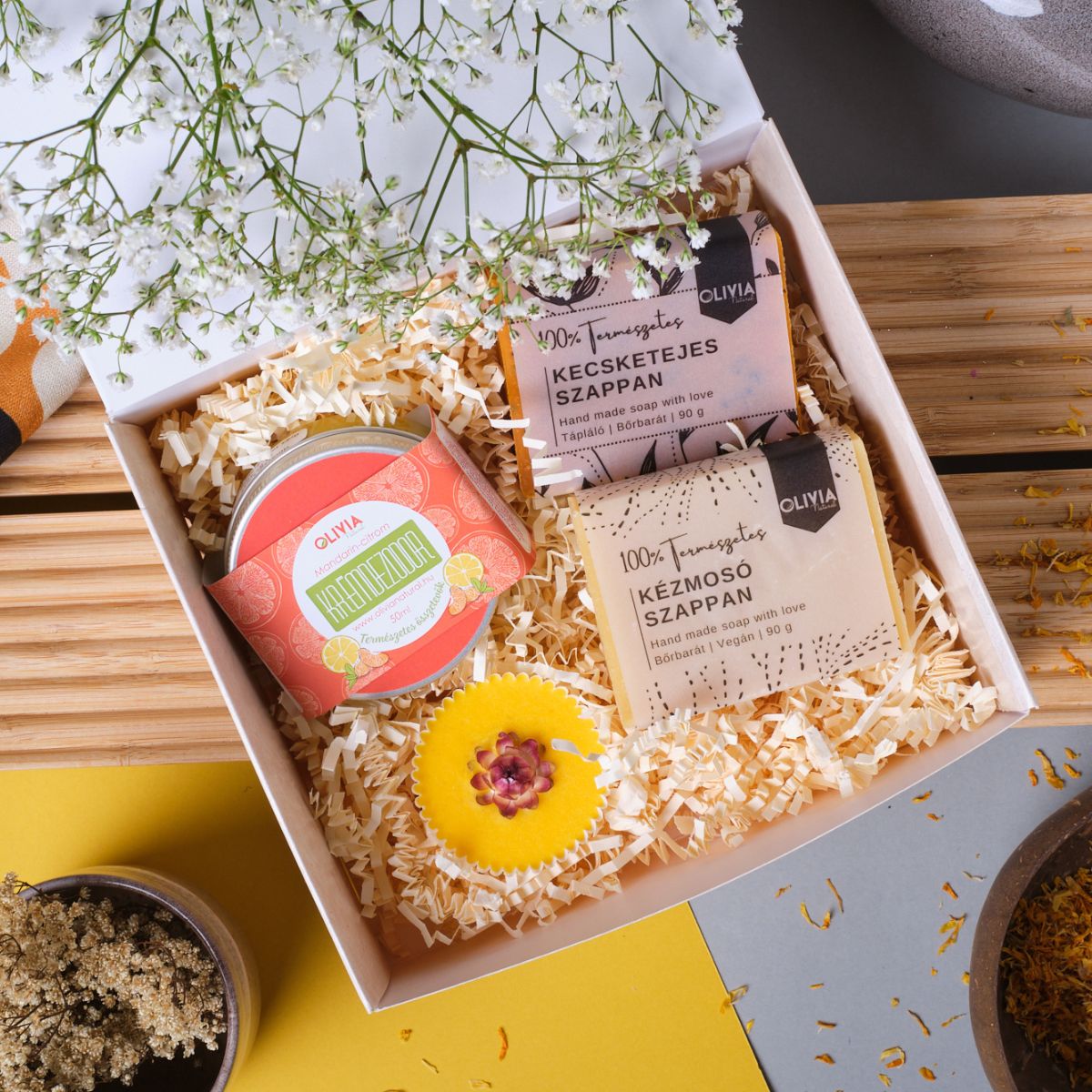 - Az ajándékcsomag tartalma: Citromfű kecsketejes szappan 90 g, Borsmenta citrom kézmosó szappan 90 g, Mandarin citrom krémdezodor 50 ml, Narancs fürdőpraliné shea vajjal 30 g