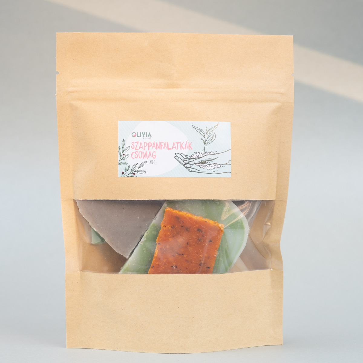 - A szappanfalatkák csomag összesen 250 g szappanvéget tartalmaz, az Olivia Natural tejles szappankínálatából véletlenszerűen válogatva. A darabszám a különböző csomagokban eltérő lehet, mivel kisebb-nagyobb szappanvégek, azaz eltérő súlyú szappan szeletek keletkeznek a gyártás során.