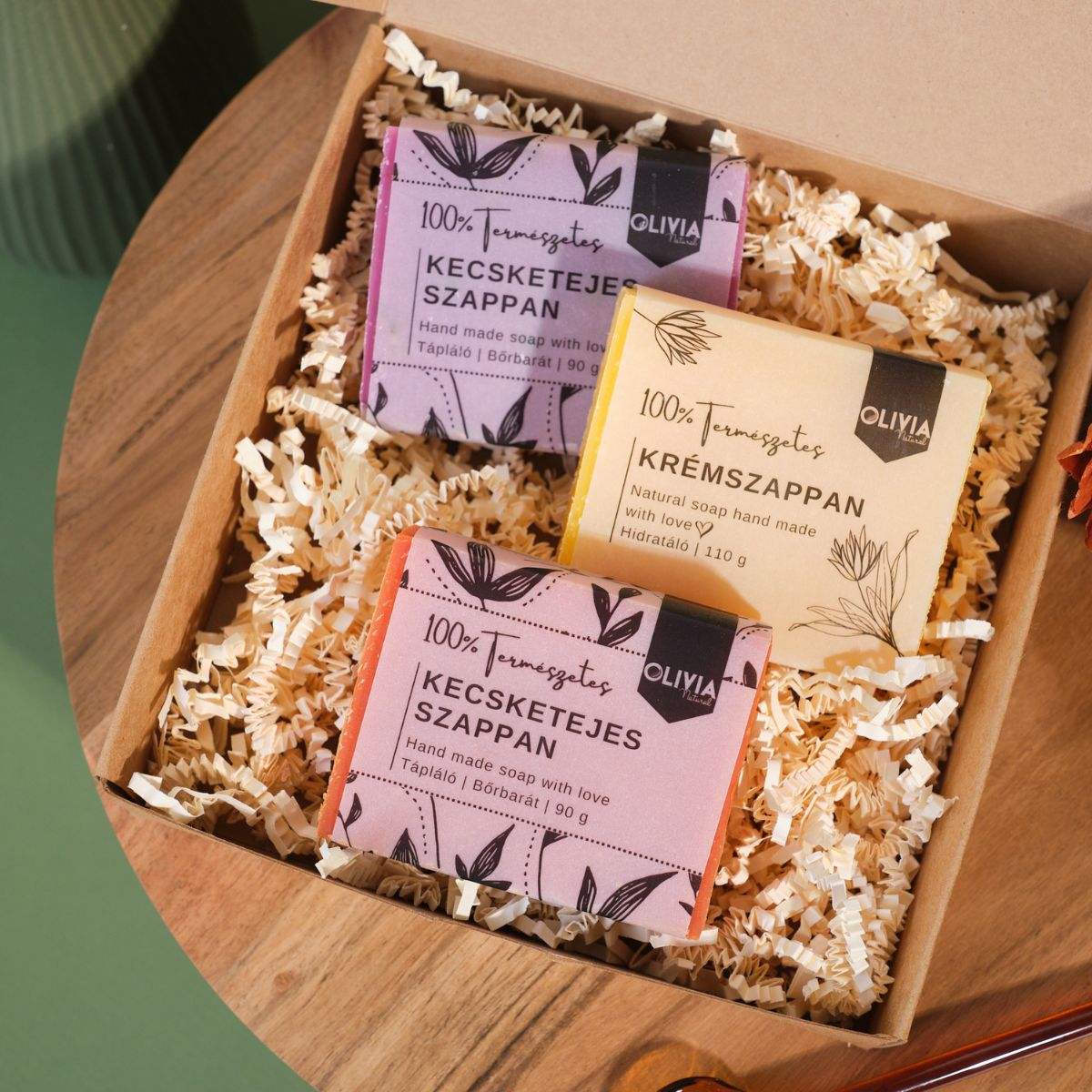 - Az ajándékcsomag tartalma: Bazsalikom mandarin Krémszappan 120 g, Levendula kecsketejes szappan 90 g, Homoktövis kecsketejes szappan 90 g